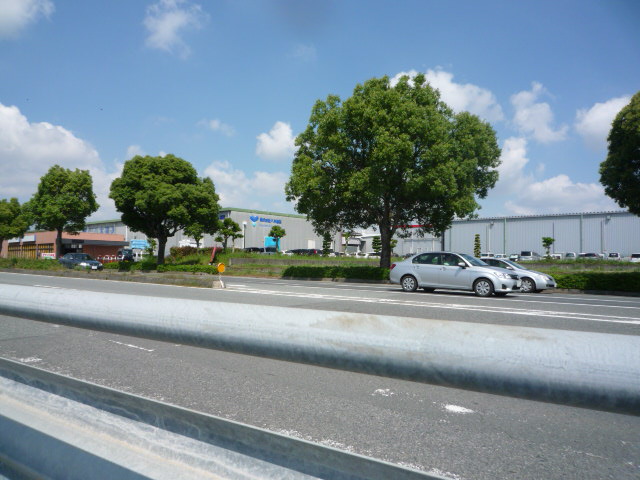 おおきな どうろには たくさんの くるまが はしっていて その りょうわきは こうだいな とちが ひろがり はたけが ありますが そのなかに かいしゃが あるかんじです。