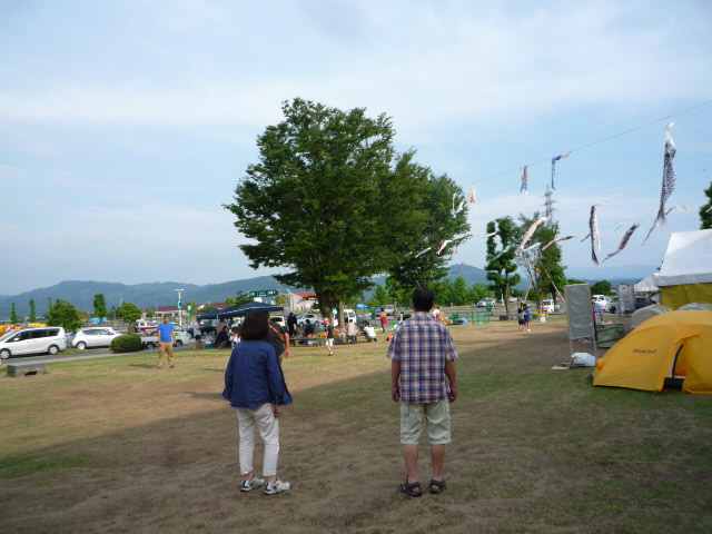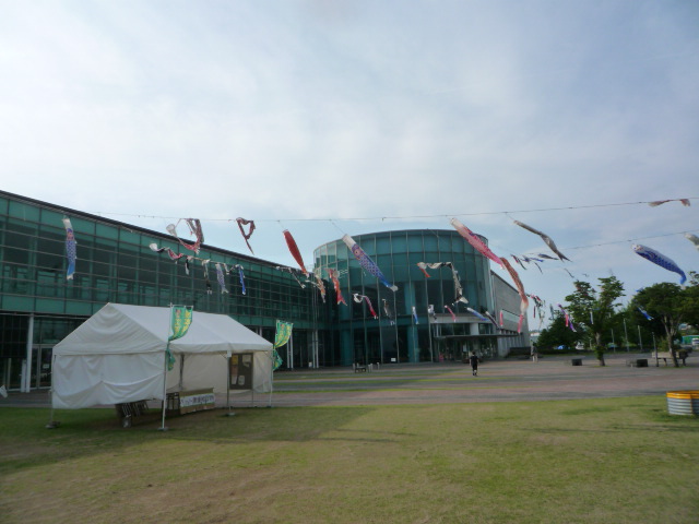 かいしゃの なまえの はいった こいのぼりが たくさん およいでいました。