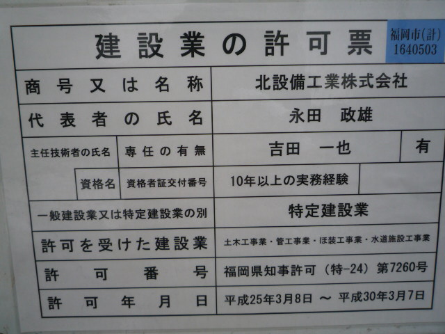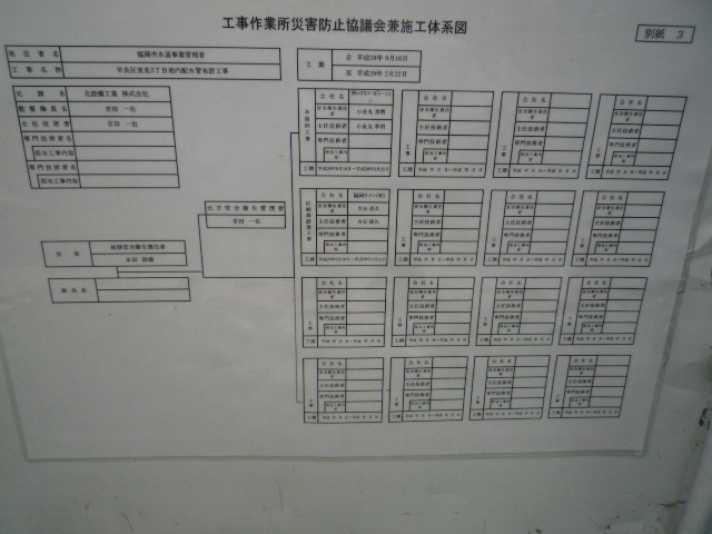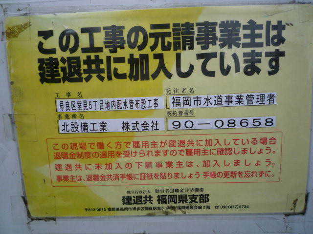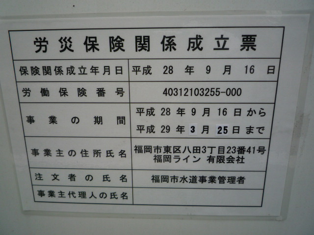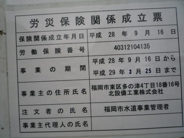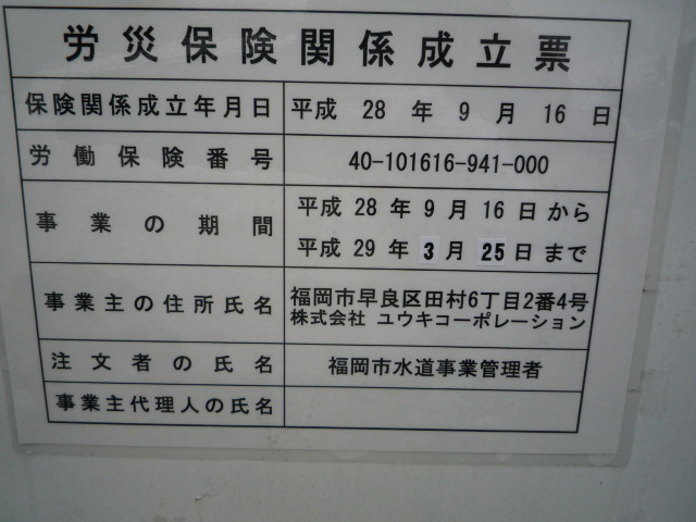 福岡市水道局西部管整備課 発注の 元請 北設備工業(株) 下請け 株)ユウキコーポレーションが2017年3月13日道路工事をしていた早良区の 道路工事の 下請けの株)ユウキコーポレーションの応援に 入っていた会社の名前と人の名前と労災保険のわかるもの。