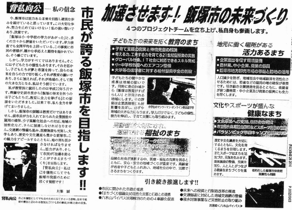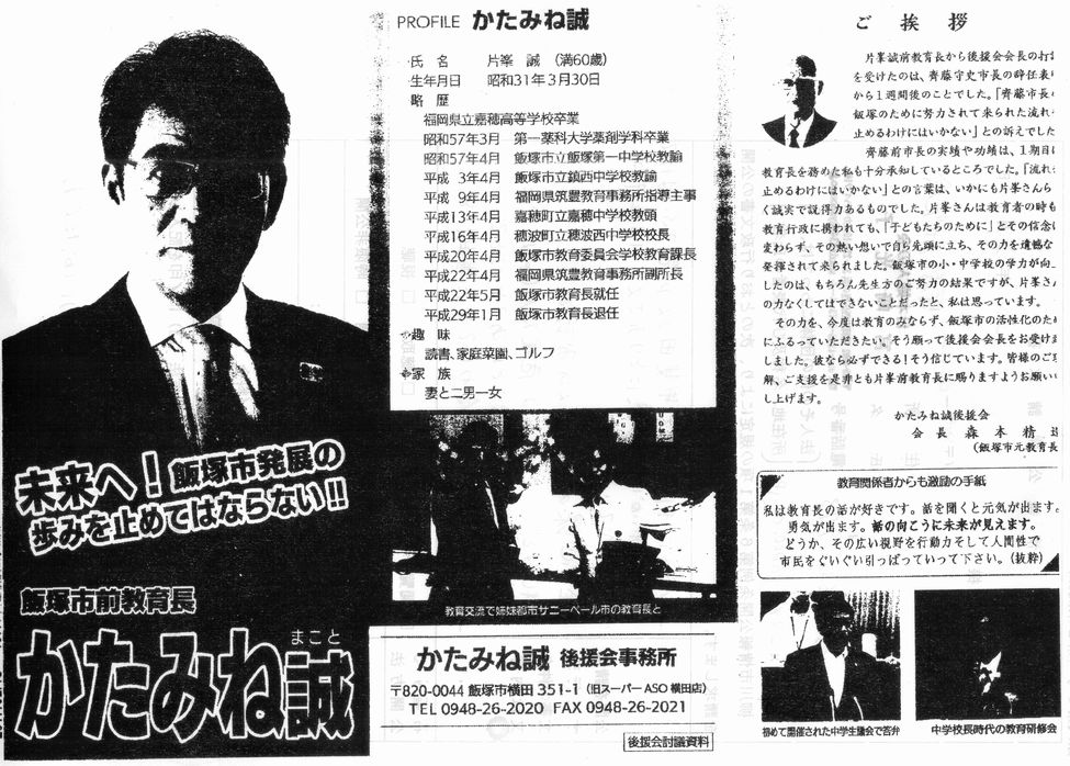 3名の立候補予定者はほぼ同世代で甲乙つけがたいが、独自の教育方針で現場を指導し、飯塚市の多くの若者を育ててきた、片峯誠氏の実績を評価する声も多く、一歩抜け出しているのは間違いないようだ。