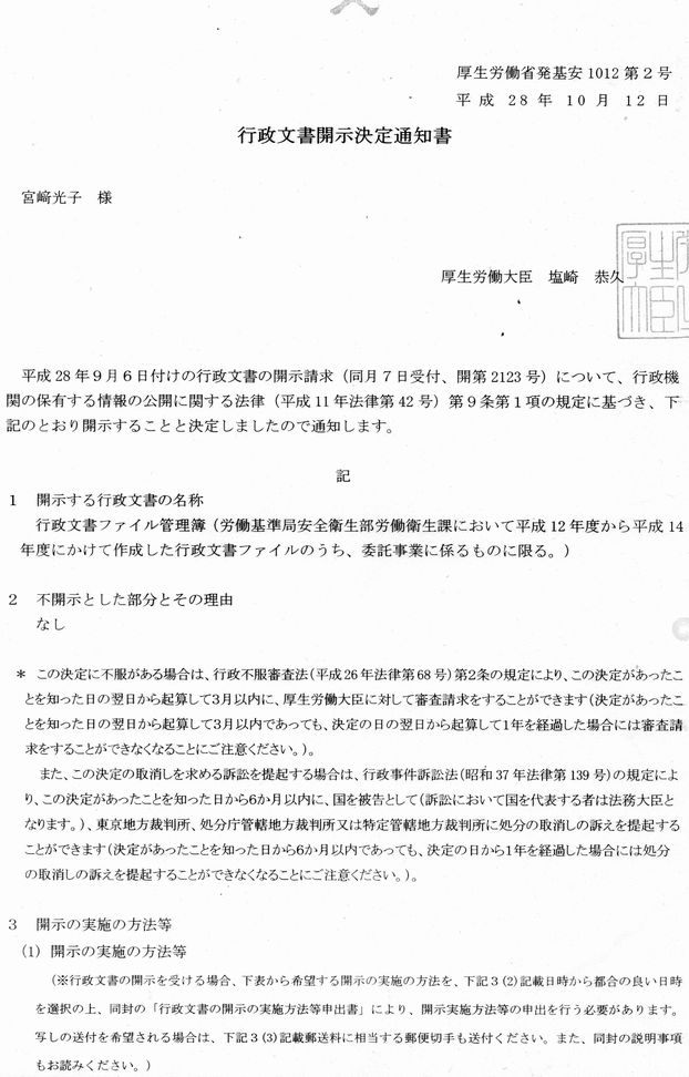 ぎょうせいぶんしょファイルかんりぼ(ろうどうきじゅんあんぜんえいせいぶろうどうえいせいか において へいせい12ねんどから へいせい14ねんど にかけて さくせいした ぎょうせいぶんしょファイルのうち、いたくじぎょうに かかるものに かぎる。)