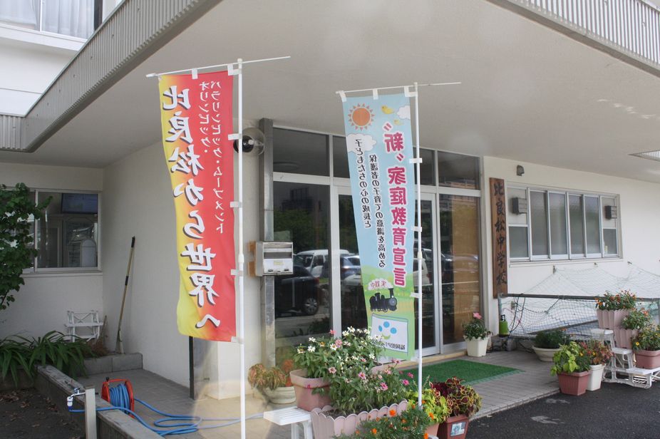 比良松中学校の門の前に「比良松から世界へ オリンピック パラリンピック ムーブメント」の旗がたくさんありました。
